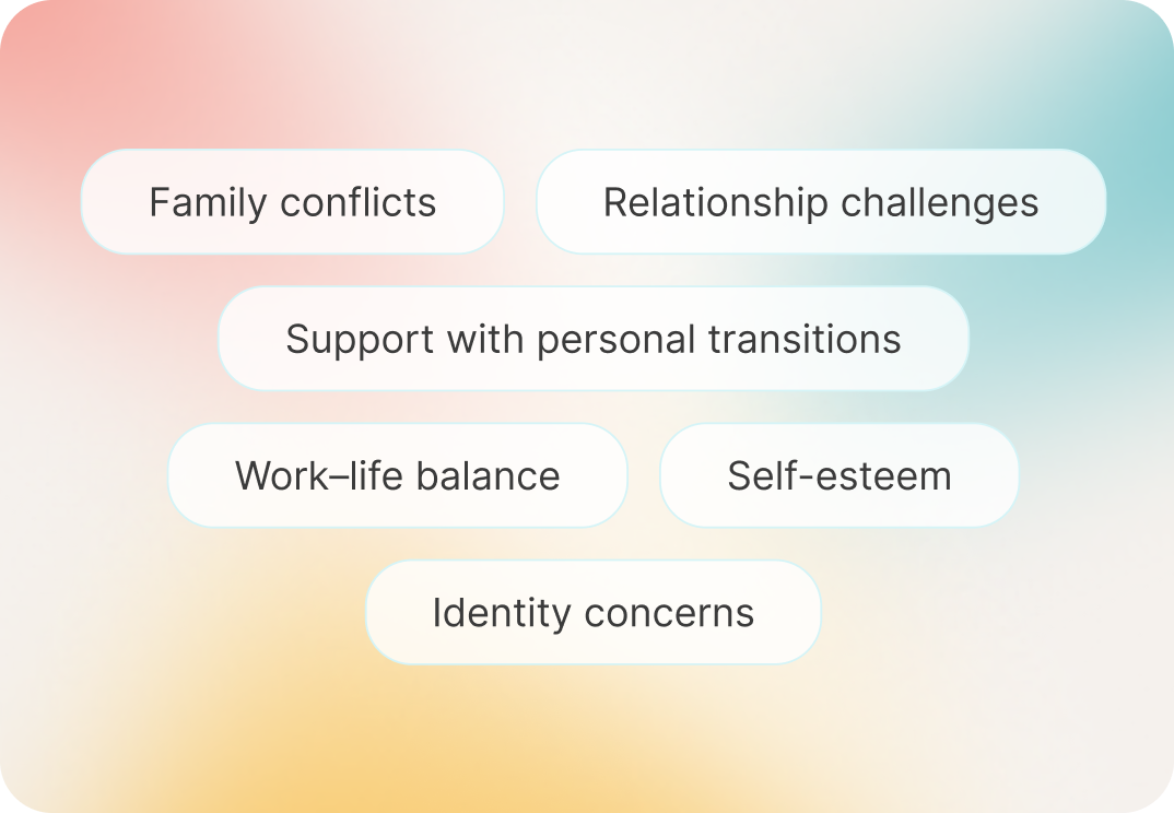 Confidential sessions via chat, phone, video, or in-person in 13+ languages, including sign language.